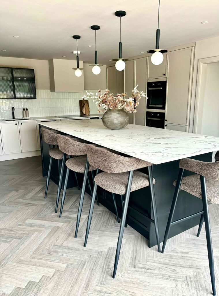 - Combine your cabinet colour with textured materials: stone worktops, tactile wood, matte finishes — these help elevate the dark tones so the kitchen feels warm and welcoming, not heavy or closed-in.